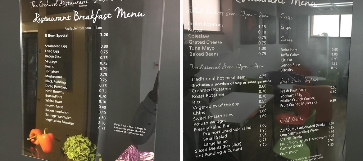 The menu includes healthy options, quick bites, and popular dishes like chips, jacket potatoes, and various cakes.